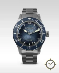 Eine Taucheruhr-Uhr mit einem 35.5mm Gehäuse im Vintage-Stil gefertigt aus Edelstahl mit einem Zifferblatt in blau und einer besonderen "sunburst"-Oberfläche.