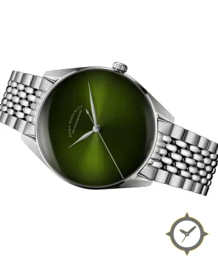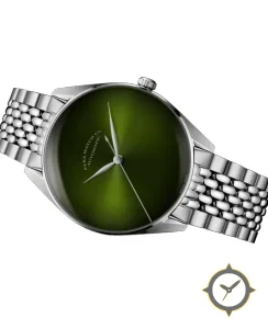 Eine Minimalistisch-Uhr mit einem 36mm Gehäuse im Vintage-Stil gefertigt aus Edelstahl mit einem Zifferblatt in grün und einer besonderen "sunburst / fumé gradient"-Oberfläche.