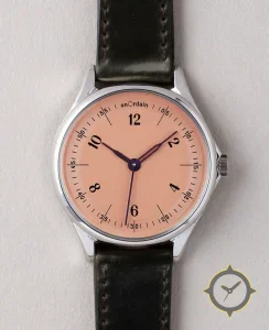 Eine Minimalistisch-Uhr mit einem vielseitigen 38mm Gehäuse, das an fast jedes Handgelenk passt, gefertigt aus Edelstahl mit einem Zifferblatt in orange und einer besonderen "smooth lacquer"-Oberfläche.