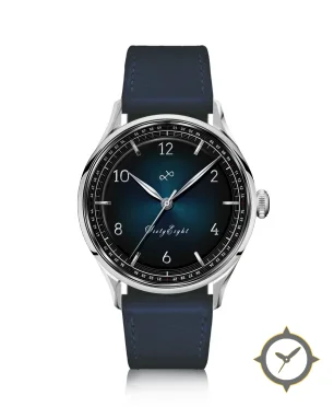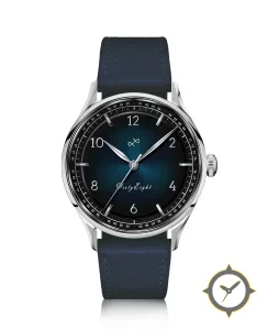 Eine Dress-Uhr mit einem vielseitigen 39.5mm Gehäuse, das an fast jedes Handgelenk passt, gefertigt aus Edelstahl mit einem Zifferblatt in blau und einer besonderen "sunburst"-Oberfläche.