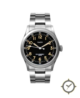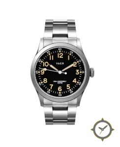 Eine Field-Uhr mit einem vielseitigen 38.5mm Gehäuse, das an fast jedes Handgelenk passt, gefertigt aus Edelstahl mit einem Zifferblatt in schwarz und einer besonderen "matte"-Oberfläche.