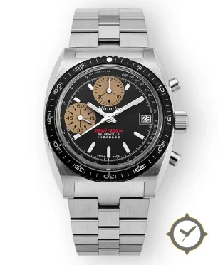 Eine Chronograph-Uhr mit einem vielseitigen 39mm Gehäuse, das an fast jedes Handgelenk passt, gefertigt aus Edelstahl mit einem Zifferblatt in schwarz und einer besonderen "matte-grain"-Oberfläche.