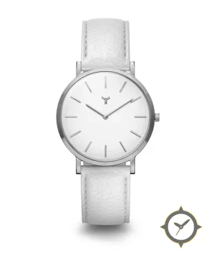 Eine Minimalistisch-Uhr mit einem 37mm Gehäuse im Vintage-Stil gefertigt aus Edelstahl mit einem Zifferblatt in weiß und einer besonderen "matte"-Oberfläche.