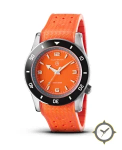 Eine Taucheruhr-Uhr gefertigt aus Edelstahl mit einem Zifferblatt in orange und einer besonderen "wavy / zigzag texture"-Oberfläche.