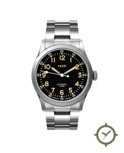 Eine Field-Uhr mit einem 31mm Gehäuse im Vintage-Stil gefertigt aus Edelstahl mit einem Zifferblatt in schwarz und einer besonderen "matte"-Oberfläche.