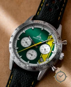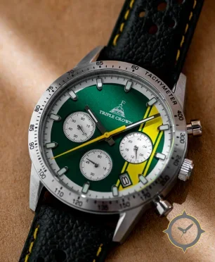 Eine Racing-Uhr mit einem markanten 46mm Auftritt am Handgelenk, gefertigt aus Edelstahl mit einem Zifferblatt in grün und einer besonderen "sunburst"-Oberfläche.
