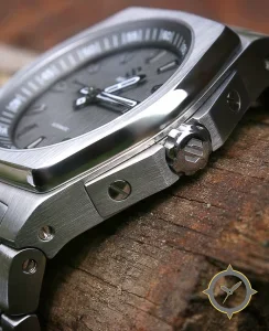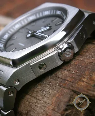 Eine Luxus-Uhr mit einem markanten 45.5mm Auftritt am Handgelenk, gefertigt aus Edelstahl mit einem Zifferblatt in grau und einer besonderen "brushed, teak-like vertical grain"-Oberfläche.