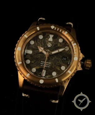 Eine Taucheruhr-Uhr mit einem markanten 45mm Auftritt am Handgelenk, gefertigt aus Bronze mit einem Zifferblatt in schwarz und einer besonderen "marbled, gold-flecked texture"-Oberfläche.