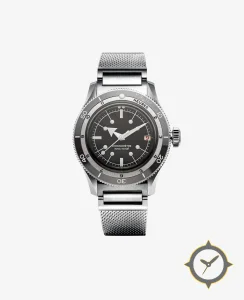 Eine Taucheruhr-Uhr mit einem markanten 41.5mm Auftritt am Handgelenk, gefertigt aus Edelstahl mit einem Zifferblatt in schwarz und einer besonderen "matte"-Oberfläche.