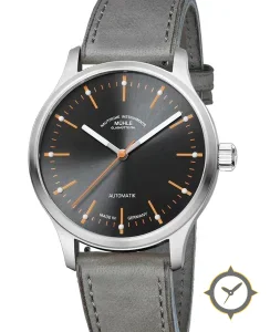 Eine Minimalistisch-Uhr mit einem 33.5mm Gehäuse im Vintage-Stil gefertigt aus Edelstahl mit einem Zifferblatt in grau und einer besonderen "sunburst"-Oberfläche.
