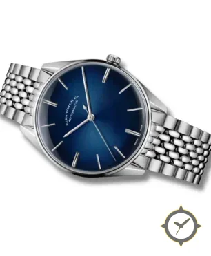 Eine Dress-Uhr mit einem 29.5mm Gehäuse im Vintage-Stil gefertigt aus Edelstahl mit einem Zifferblatt in blau und einer besonderen "sunburst (fumé gradient)"-Oberfläche.