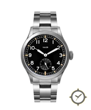 Eine Field-Uhr mit einem markanten 45.5mm Auftritt am Handgelenk, gefertigt aus Edelstahl mit einem Zifferblatt in schwarz und einer besonderen "matte"-Oberfläche.