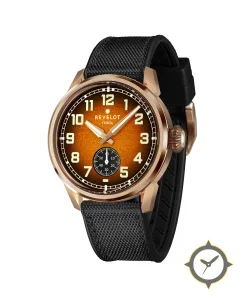 Eine Pilot-Uhr mit einem markanten 45mm Auftritt am Handgelenk, gefertigt aus Gold mit einem Zifferblatt in braun und einer besonderen "fumé sunburst / gradient with textured grain"-Oberfläche.