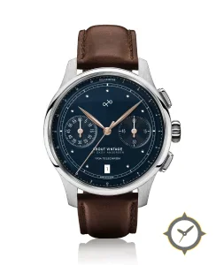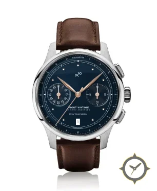 Eine Chronograph-Uhr mit einem markanten 41.5mm Auftritt am Handgelenk, gefertigt aus Edelstahl mit einem Zifferblatt in marineblau und einer besonderen "sunburst"-Oberfläche.