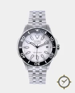 Eine Taucheruhr-Uhr mit einem 36mm Gehäuse im Vintage-Stil gefertigt aus Edelstahl mit einem Zifferblatt in weiß und einer besonderen "honeycomb"-Oberfläche.