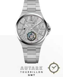 Eine GMT-Uhr mit einem markanten 43.5mm Auftritt am Handgelenk, gefertigt aus Edelstahl mit einem Zifferblatt in silber und einer besonderen "meteorite (Widmanstätten pattern)"-Oberfläche und einer echten GMT-Funktion, mit der du eine zweite Zeitzone verfolgen kannst.
