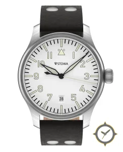 Eine Pilot-Uhr mit einem markanten 43mm Auftritt am Handgelenk, gefertigt aus Edelstahl mit einem Zifferblatt in weiß und einer besonderen "matte"-Oberfläche.