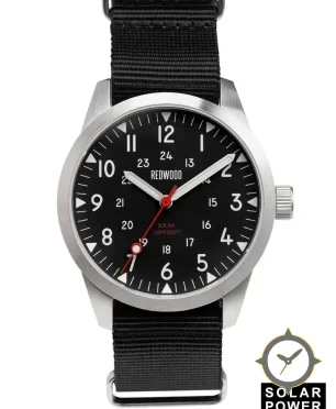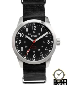Eine Field-Uhr mit einem 33.5mm Gehäuse im Vintage-Stil gefertigt aus Edelstahl mit einem Zifferblatt in schwarz und einer besonderen "matte"-Oberfläche.