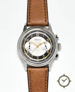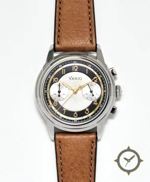 Eine Chronograph-Uhr mit einem 31.5mm Gehäuse im Vintage-Stil gefertigt aus Edelstahl mit einem Zifferblatt in weiß und einer besonderen "guilloche"-Oberfläche.