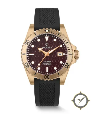 Eine Taucheruhr-Uhr mit einem 34mm Gehäuse im Vintage-Stil gefertigt aus Bronze mit einem Zifferblatt in karmesinrot und einer besonderen "honeycomb texture"-Oberfläche.