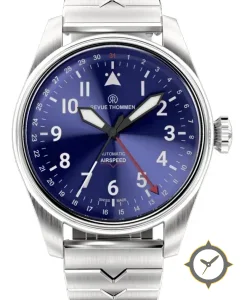Eine Pilot-Uhr mit einem markanten 41.5mm Auftritt am Handgelenk, gefertigt aus Edelstahl mit einem Zifferblatt in blau und einer besonderen "sunburst"-Oberfläche.