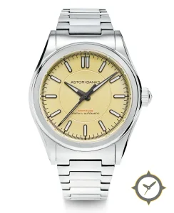 Eine Sport-Uhr mit einem vielseitigen 40mm Gehäuse, das an fast jedes Handgelenk passt, gefertigt aus Edelstahl mit einem Zifferblatt in gold und einer besonderen "matte"-Oberfläche.