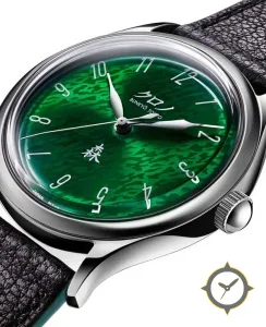 Eine Dress-Uhr gefertigt aus Edelstahl mit einem Zifferblatt in grün und einer besonderen "textured wavy/guilloché-like finish"-Oberfläche.