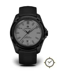 Eine Minimalistisch-Uhr mit einem markanten 48mm Auftritt am Handgelenk, gefertigt aus Edelstahl mit einem Zifferblatt in grau und einer besonderen "matte"-Oberfläche.