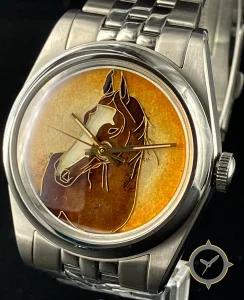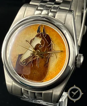 Eine Dress-Uhr mit einem vielseitigen 40.5mm Gehäuse, das an fast jedes Handgelenk passt, gefertigt aus Edelstahl mit einem Zifferblatt in gold und einer besonderen "painted enamel (hand-painted horse motif)"-Oberfläche.
