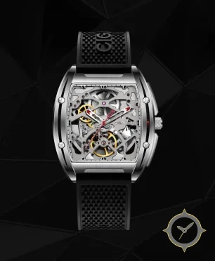 Eine Skelett-Uhr gefertigt aus Edelstahl mit einem Zifferblatt in silber und einer besonderen "skeletonized/open-worked"-Oberfläche.
