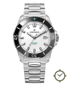 Eine Taucheruhr-Uhr mit einem 34mm Gehäuse im Vintage-Stil gefertigt aus Edelstahl mit einem Zifferblatt in weiß und einer besonderen "ceramic (gloss)"-Oberfläche.