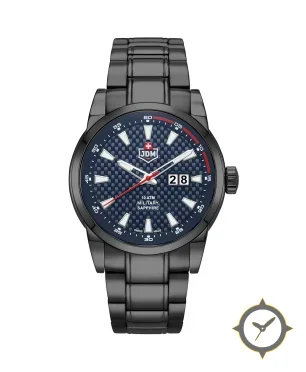 Eine Militär-Uhr mit einem markanten 51mm Auftritt am Handgelenk, gefertigt aus Edelstahl mit einem Zifferblatt in marineblau und einer besonderen "carbon-fiber weave"-Oberfläche.