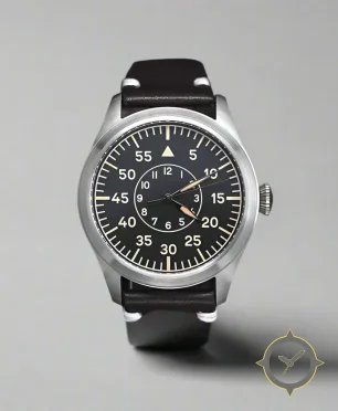 Eine Pilot-Uhr mit einem markanten 43.5mm Auftritt am Handgelenk, gefertigt aus Edelstahl mit einem Zifferblatt in schwarz und einer besonderen "matte"-Oberfläche.