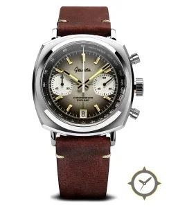 Eine Chronograph-Uhr mit einem markanten 45mm Auftritt am Handgelenk, gefertigt aus Edelstahl mit einem Zifferblatt in braun und einer besonderen "fumé gradient with sunburst finish"-Oberfläche.