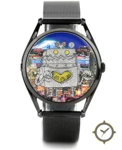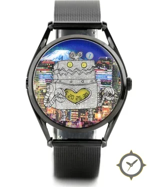 Eine Digital-Uhr mit einem markanten 41.5mm Auftritt am Handgelenk, gefertigt aus Edelstahl mit einem Zifferblatt in blau und einer besonderen "holographic printed surface"-Oberfläche.