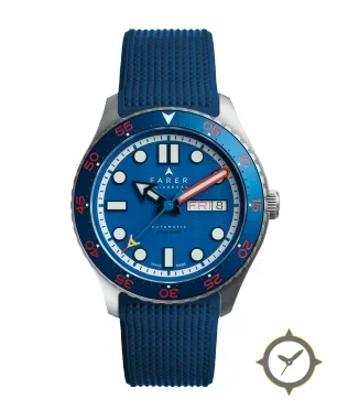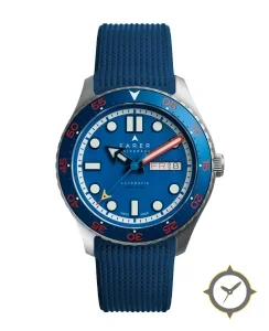 Eine Taucheruhr-Uhr mit einem markanten 44.5mm Auftritt am Handgelenk, gefertigt aus Edelstahl mit einem Zifferblatt in blau und einer besonderen "textured wavy finish"-Oberfläche.