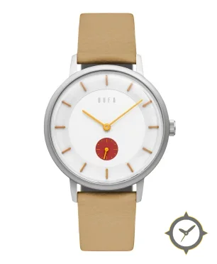 Eine Minimalistisch-Uhr mit einem vielseitigen 40mm Gehäuse, das an fast jedes Handgelenk passt, gefertigt aus Edelstahl mit einem Zifferblatt in weiß und einer besonderen "matte"-Oberfläche.