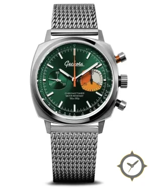 Eine Chronograph-Uhr mit einem vielseitigen 38mm Gehäuse, das an fast jedes Handgelenk passt, gefertigt aus Edelstahl mit einem Zifferblatt in grün und einer besonderen "sunburst"-Oberfläche.