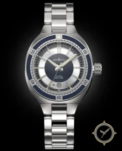 Eine Taucheruhr-Uhr mit einem 37mm Gehäuse im Vintage-Stil gefertigt aus Edelstahl mit einem Zifferblatt in marineblau und einer besonderen "sunburst (brushed)"-Oberfläche.