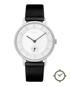 Eine Minimalistisch-Uhr mit einem vielseitigen 38.5mm Gehäuse, das an fast jedes Handgelenk passt, gefertigt aus Edelstahl mit einem Zifferblatt in weiß und einer besonderen "matte"-Oberfläche.