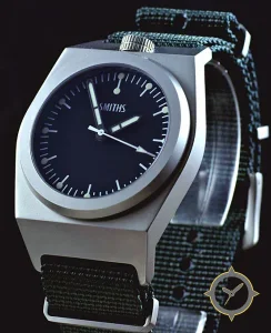 Eine Militär-Uhr mit einem markanten 41.5mm Auftritt am Handgelenk, gefertigt aus Edelstahl mit einem Zifferblatt in schwarz und einer besonderen "matte"-Oberfläche.