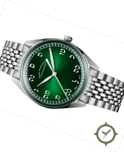 Eine Dress-Uhr mit einem markanten 45.5mm Auftritt am Handgelenk, gefertigt aus Edelstahl mit einem Zifferblatt in grün und einer besonderen "sunburst"-Oberfläche.