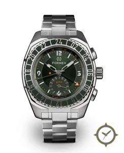 Eine -Uhr mit einem markanten 44mm Auftritt am Handgelenk, gefertigt aus Edelstahl mit einem Zifferblatt in grün und einer besonderen "sunburst"-Oberfläche.