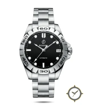 Eine Taucheruhr-Uhr mit einem markanten 48.5mm Auftritt am Handgelenk, gefertigt aus Edelstahl mit einem Zifferblatt in schwarz und einer besonderen "matte"-Oberfläche.