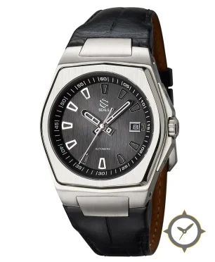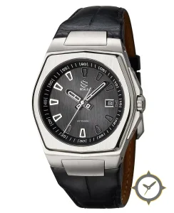 Eine Luxus-Uhr mit einem vielseitigen 41mm Gehäuse, das an fast jedes Handgelenk passt, gefertigt aus Edelstahl mit einem Zifferblatt in grau und einer besonderen "vertical brushed finish"-Oberfläche.