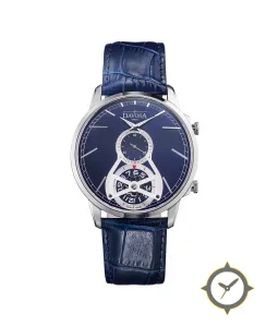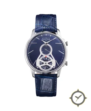 Eine Dress-Uhr mit einem 34.5mm Gehäuse im Vintage-Stil gefertigt aus Edelstahl mit einem Zifferblatt in blau und einer besonderen "sunburst / lacquer finish"-Oberfläche.