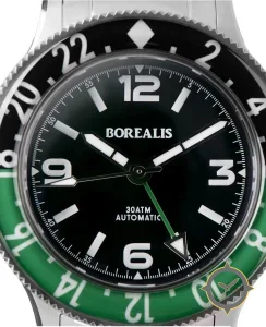 Eine GMT-Uhr mit einem 32.5mm Gehäuse im Vintage-Stil gefertigt aus Edelstahl mit einem Zifferblatt in schwarz und einer besonderen "glossy"-Oberfläche und einer echten GMT-Funktion, mit der du eine zweite Zeitzone verfolgen kannst.