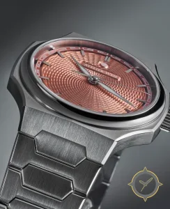 Eine Luxus-Uhr mit einem vielseitigen 41mm Gehäuse, das an fast jedes Handgelenk passt, gefertigt aus Edelstahl mit einem Zifferblatt in braun und einer besonderen "spiral guilloche (engine-turned)"-Oberfläche.