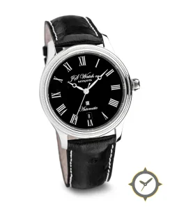 Eine Dress-Uhr mit einem vielseitigen 38.5mm Gehäuse, das an fast jedes Handgelenk passt, gefertigt aus Edelstahl mit einem Zifferblatt in schwarz und einer besonderen "glossy"-Oberfläche.