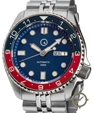 Eine Taucheruhr-Uhr mit einem vielseitigen 39mm Gehäuse, das an fast jedes Handgelenk passt, gefertigt aus Edelstahl mit einem Zifferblatt in blau und einer besonderen "sunburst"-Oberfläche.